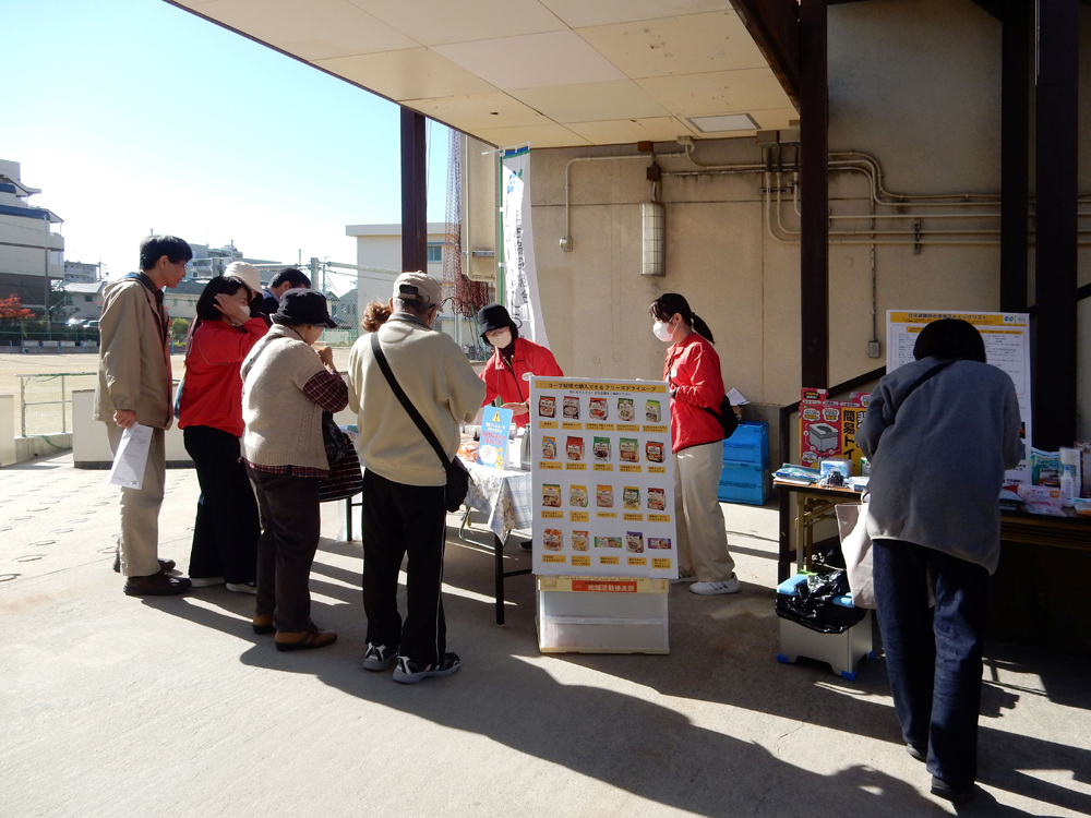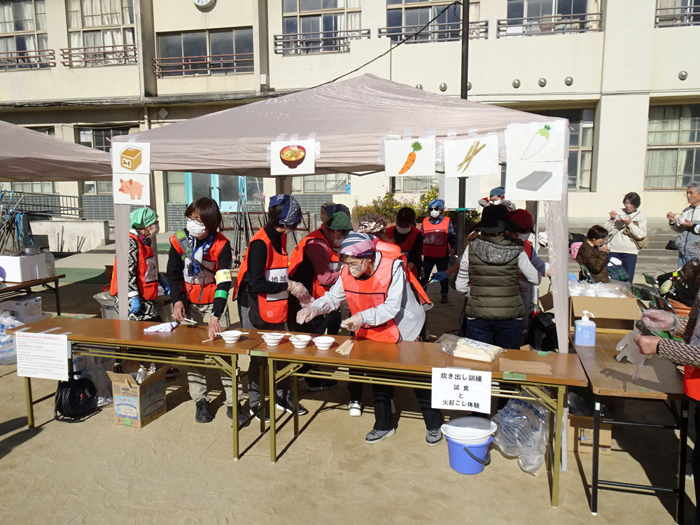 地震等の災害が発生して避難所が開設された際、救援物資が届くまでの間、地域で炊き出しができるようにした方が良いという考えから、当協議会では大なべを煮炊きできるかまどを購入しました。今回、このかまどを使って初めて豚汁を作り、参加者の皆さんへ試食してもらいました。また、外国人だけでなく、アレルギーがある人にもわかるように、使っている食材のイラストを掲示しました。